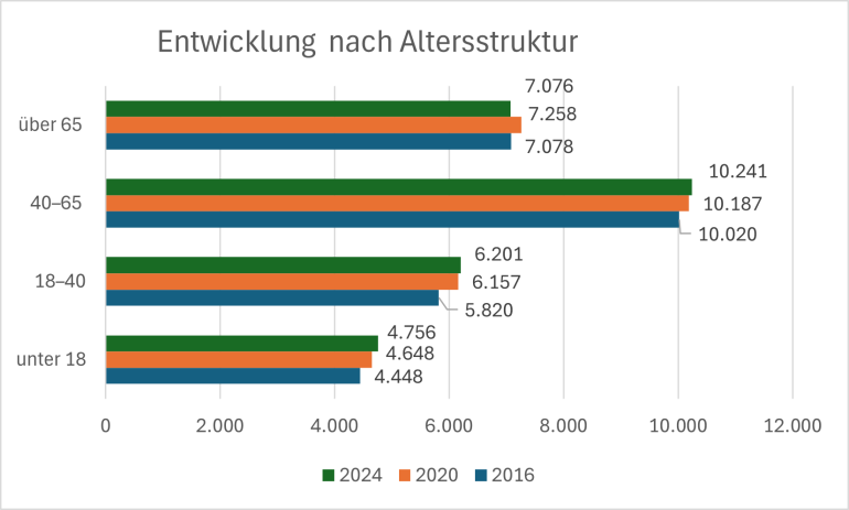 Ein genauerer Blick auf die Altersstruktur unterstreicht diese Stabilität. Die größte Bevölkerungsgruppe stellen weiterhin die 40- bis 65-Jährigen, deren Zahl sich über die Jahre nur geringfügig verändert hat. Gleichzeitig ist die Gruppe der 18- bis 40-Jährigen leicht gewachsen. Auch die Zahl der Kinder und Jugendlichen ist moderat gestiegen, während sich die Gruppe der über 65-Jährigen zuletzt eher seitwärts entwickelt hat.