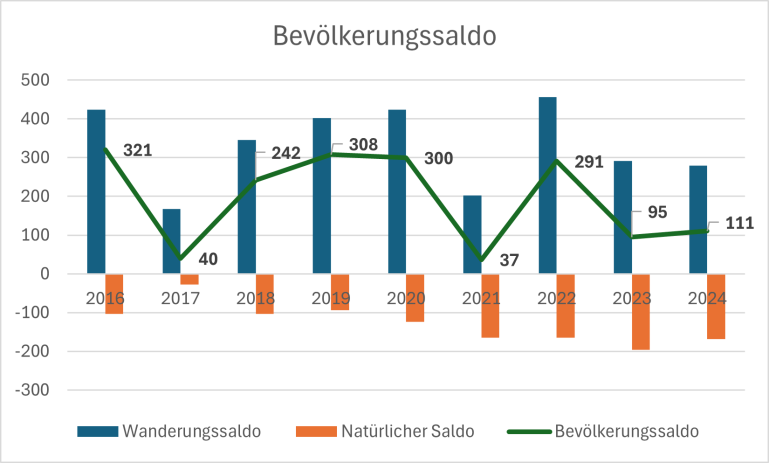Reinbek weist seit Jahren einen positiven Zuzug auf, während der natürliche Saldo , also die Differenz aus Geburten und Sterbefällen,  durchgehend negativ ist. Das Bevölkerungswachstum resultiert somit fast ausschließlich aus Wanderungsbewegungen. In Jahren mit hoher Zuwanderung steigt die Einwohnerzahl deutlich, in Phasen geringerer Zuzüge kommt es hingegen schnell zu einer Stagnation. Diese Abhängigkeit vom Wanderungssaldo macht die demografische Entwicklung sensibel gegenüber Veränderungen der Standortattraktivität, ohne jedoch aktuell ein erhöhtes Risiko zu signalisieren.