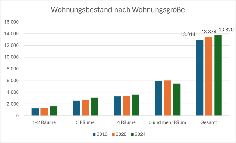 Besonders sichtbar wird dies bei den Regelleistungsberechtigten nach dem SGB II und den Bedarfsgemeinschaften. Beide Kennzahlen sind im Betrachtungszeitraum gestiegen. Ein großer Teil dieser Haushalte lebt in Mietwohnungen. Damit entsteht ein direkter Zusammenhang zwischen Arbeitsmarktlage und Nachfrage nach preisgünstigem Wohnraum. Die Entwicklung weist auf eine zunehmende soziale Differenzierung innerhalb der Stadt hin.