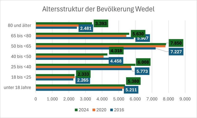 Wenn Du Dir die Altersstruktur-Grafik anschaust, zeigt sich auf den ersten Blick etwas, das viele Standorte im Umland derzeit erleben: Die Bevölkerung wird älter. In Wedel ist dieser Effekt besonders gut sichtbar, weil er sich über mehrere Jahre hinweg sehr gleichmäßig vollzogen hat. Die Balken der Gruppe ab 65 Jahren wachsen, während jüngere Altersgruppen weitgehend stabil bleiben.