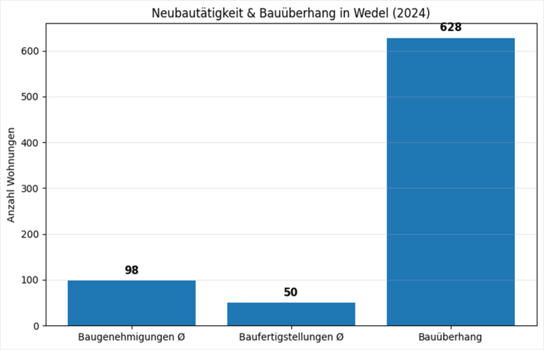 Die Grafik zeigt außerdem den Bauüberhang also genehmigte, aber noch nicht realisierte Wohnungen. Das verdeutlicht, dass selbst dort, wo gebaut werden dürfte, Zeit, Kosten und Umsetzung den Markt bremsen. Neubau entsteht in Wedel nicht schnell, sondern bedacht.