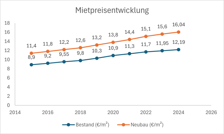 Wenn man sich die aktuellen Medianmieten anschaut, wird dieses Bild greifbar. Bestandswohnungen bewegen sich bei rund 12,19 Euro pro Quadratmeter, Neubauwohnungen bei etwa 16,04 Euro.