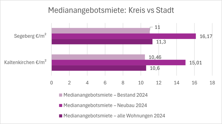 Die Entwicklung des Mietmarktes spiegelt diese Angebotsstruktur deutlich wider. Kaltenkirchen liegt preislich weiterhin leicht unter dem Durchschnitt des Kreises Segeberg, was den Standort insbesondere für Haushalte attraktiv macht, die aus teureren Regionen zuziehen. Gleichzeitig zeigt sich jedoch eine klare Aufwärtsbewegung der Mietpreise.